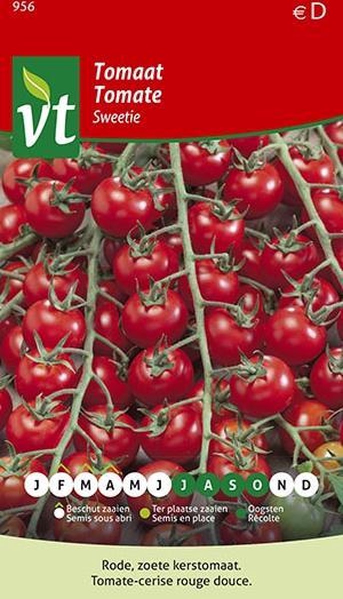 De Tomaat sweetie Variëteit van rode kers- of mini-tomaatjes met een zoete smaak kan je het beste zaaien op een Zonrijke plek. Daar groeit deze het beste.